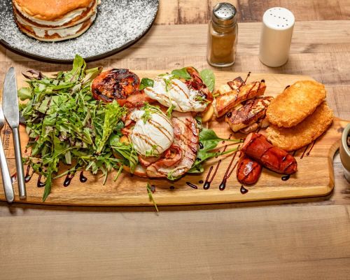 Two eggs your way served with bacon, chorizo, hash brown, halloumi, mushrooms, avocado, spinach and roasted tomato with hollandaise sauce served on ciabatta