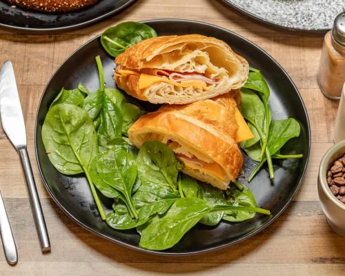 Flaky, buttery pastry perfect for breakfast. Enjoy it on its own or customise with optional ham and cheese for a savoury twist (as pictured).