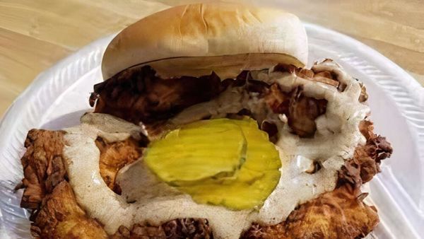 Two fried eggs, bacon, hash browns, melted American cheese, tomato relish, and garlic aioli on a brioche bun