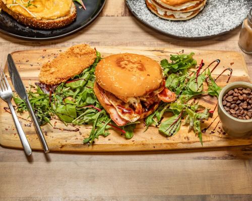 2 fried eggs, American cheese, potato gem, avocado, grilled haloumi and relish served on a brioche bun